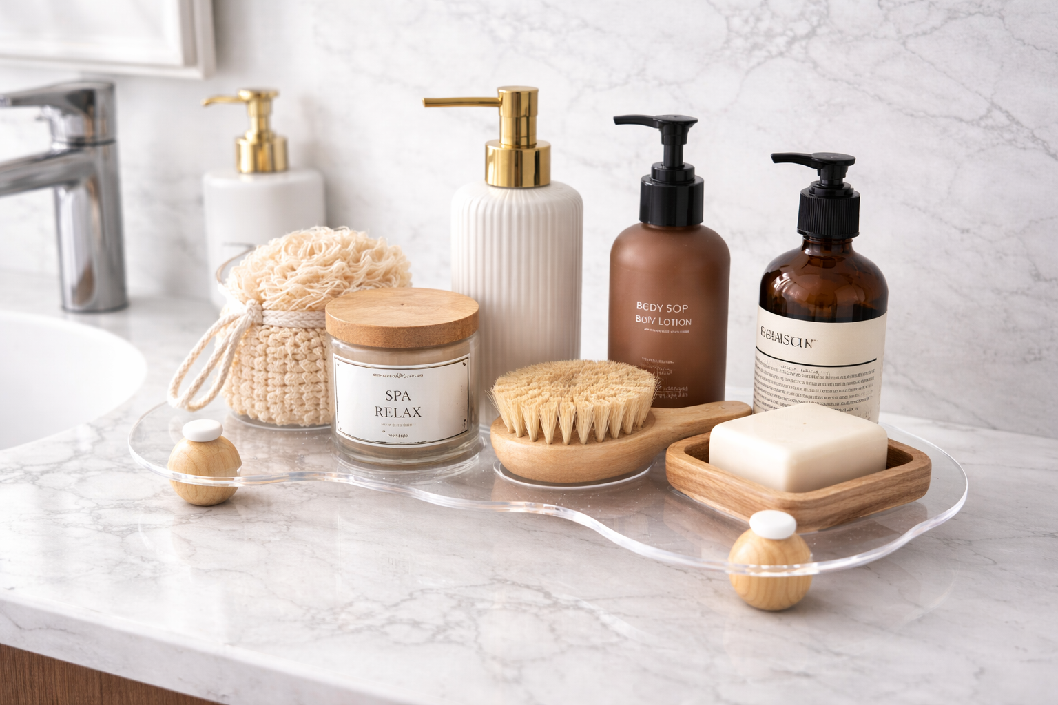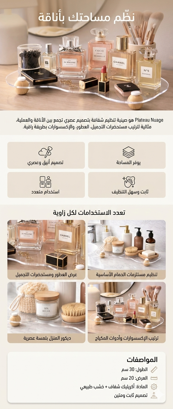 Fabriqué en acrylique transparent haute qualité et soutenu par des pieds en bois naturel, ce plateau combine solidité, stabilité et élégance moderne. Son format idéal (30 × 20 cm) permet d’organiser facilement :