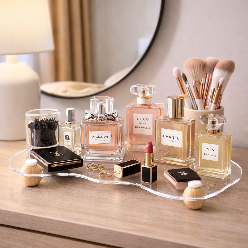 Plateau Organisateur Nuage Élégance en Acrylique Transparent avec Pieds en Bois Naturel